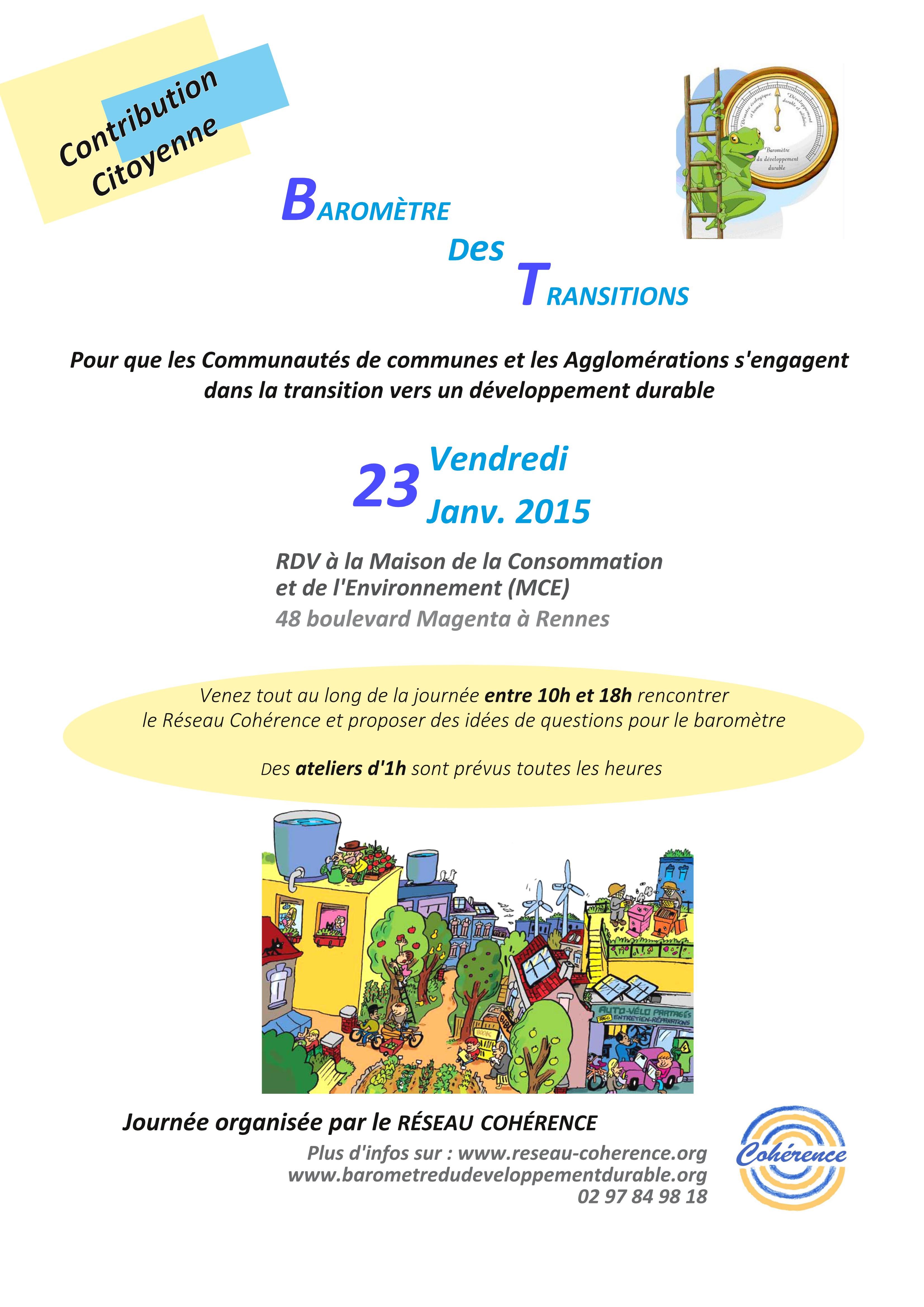 Actualités VENDREDI 23 JANVIER : JOURNEE DE CONTRIBUTION AU BAROMETRE DES TRANSITIONS A LA MCE DE RENNES 20 janvier 2015 Julian Pondaven Pour la contribution en ligne c’est par ici