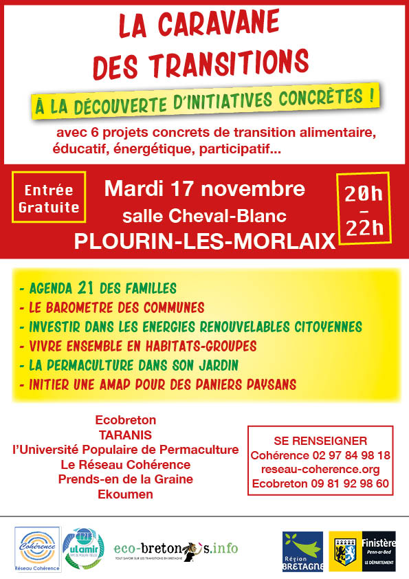 C’est dans le finistère, à côté de Morlaix, que s’arrêtera la prochaine Caravane des Transitions ! Venez découvrir le mardi 17 novembre – à partir de 20h – six projets de transition énergétique, alimentaire, éducatif… :