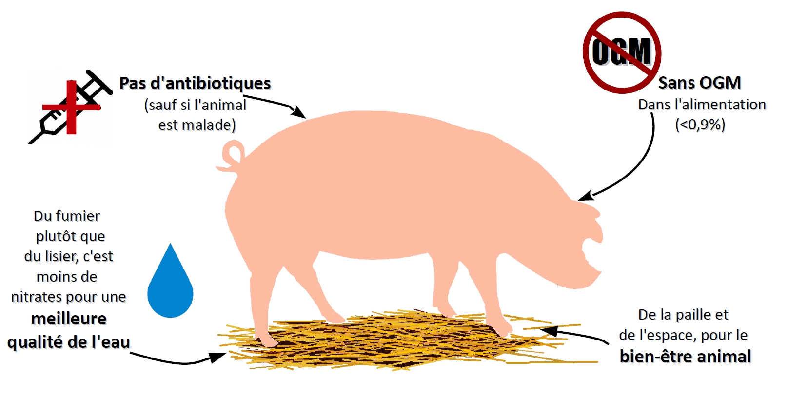 Pour cela, il est possible d’élever les animaux sur paille : outre un bien-être évident pour les cochons (et donc moins d’antibiotiques !), cela permet un compostage des déjections, qui limite les pollutions et préserve la qualité de l’eau. De même, l’air dans et autour des bâtiments est respirable, moins riche en ammoniac.