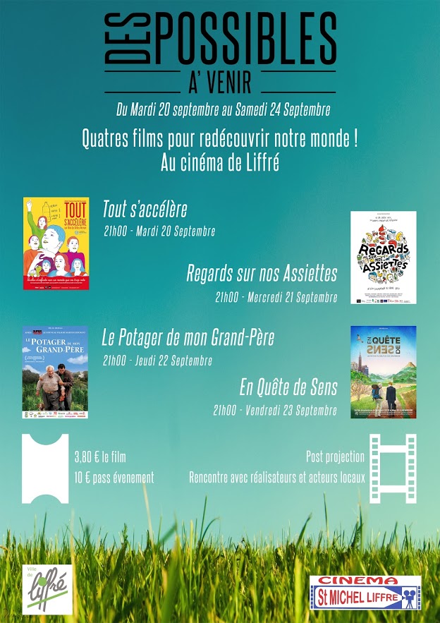 s’accélère – Mercredi 21h: Regards sur nos assiettes – Jeudi 21h: Le Potager de mon Grand-Père – Vendredi 21h: En Quête de Sens Le cinéma est un outil qui peut nous amener à discuter des sujets essentiels pour la transition. Ainsi, c’est à travers un partenariat avec le cinéma de la ville de Liffré et son centre culturel que nait « Des possibles A’Venir ». Quatre films pour aborder la transition à travers le grand écran. En plus des projections, venez découvrir des initiatives locales lors des après séances !