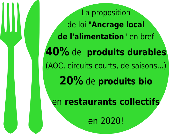 Cette proposition de loi fait suite aux préconisations du rapport parlementaire « Et si on mangeait local… » adopté en juillet 2015 par la commission des affaires économiques de l’Assemblée nationale. Elle s’inscrit dans la continuité des auditions menées par la mission d’information parlementaire sur les circuits courts et la relocalisation des filières agro-alimentaires. Elle vise à introduire 40% de produits labellisés, en circuits courts restauration collective publique et 20% de produits issus de l’agriculture biologique.